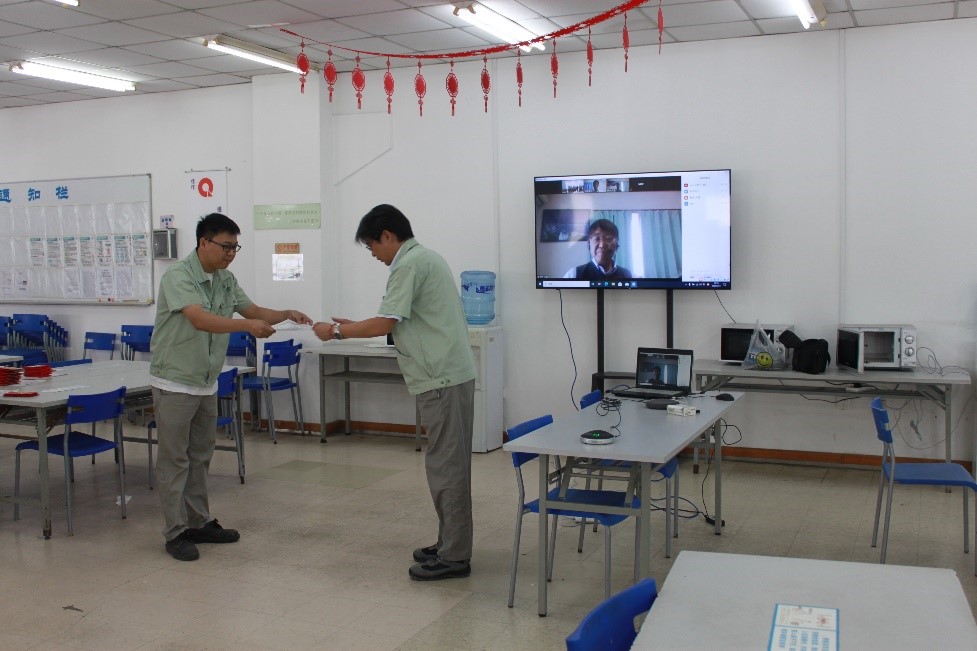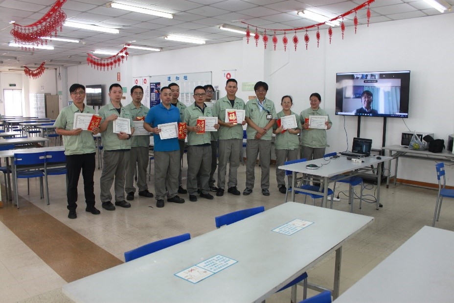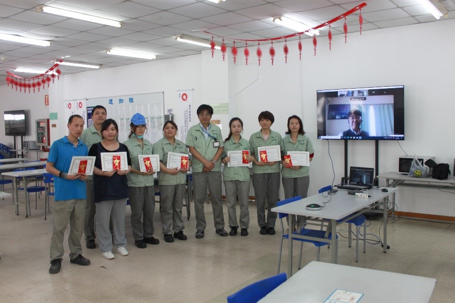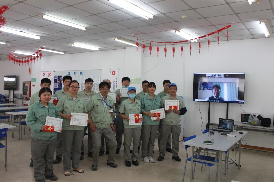 2021年(nián)5月(yuè)31日(₽ ☆rì),員(yuán)工(gōng)勤續獎發放(fàng)在食堂二樓進行(xí↕↕ φng),因為(wèi)疫情的(de)原因∏σ,會(huì)議(yì)由大(dà)屋總經理(lǐ)遠(y₹λuǎn)程主持,塩尻總工(gōng)程師(shī)代為(w∑ &×èi)發放(fàng)。